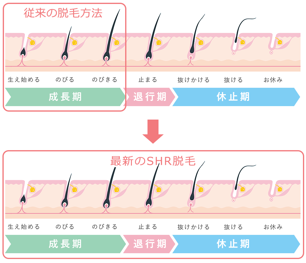 従来の脱毛器は成長期の毛にしか効果がありませんでした。ですがビューティアリスの脱毛器は周期関係なくすべての毛に効果があります(*^^*)なので2~3週間に1回のペースで通っていただけるため短期間で完了できちゃいます☆