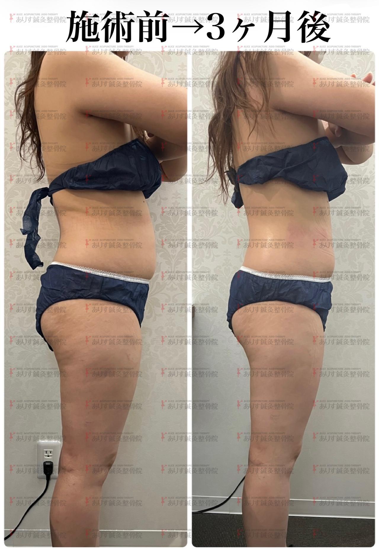 体重は-3キロと大きく変わってはいませんが、ポッコリ出ていた下腹がわずか3カ月でなくなりました!体重はさほど変化がなく、ここまでサイズダウンされたということはダイエットに必要な筋肉はそのままでいらない脂肪のみが落ちたことになります♪背中の脂肪もなくなり横から見ると身体のラインがとてもキレイになっています(≧▽≦)!!