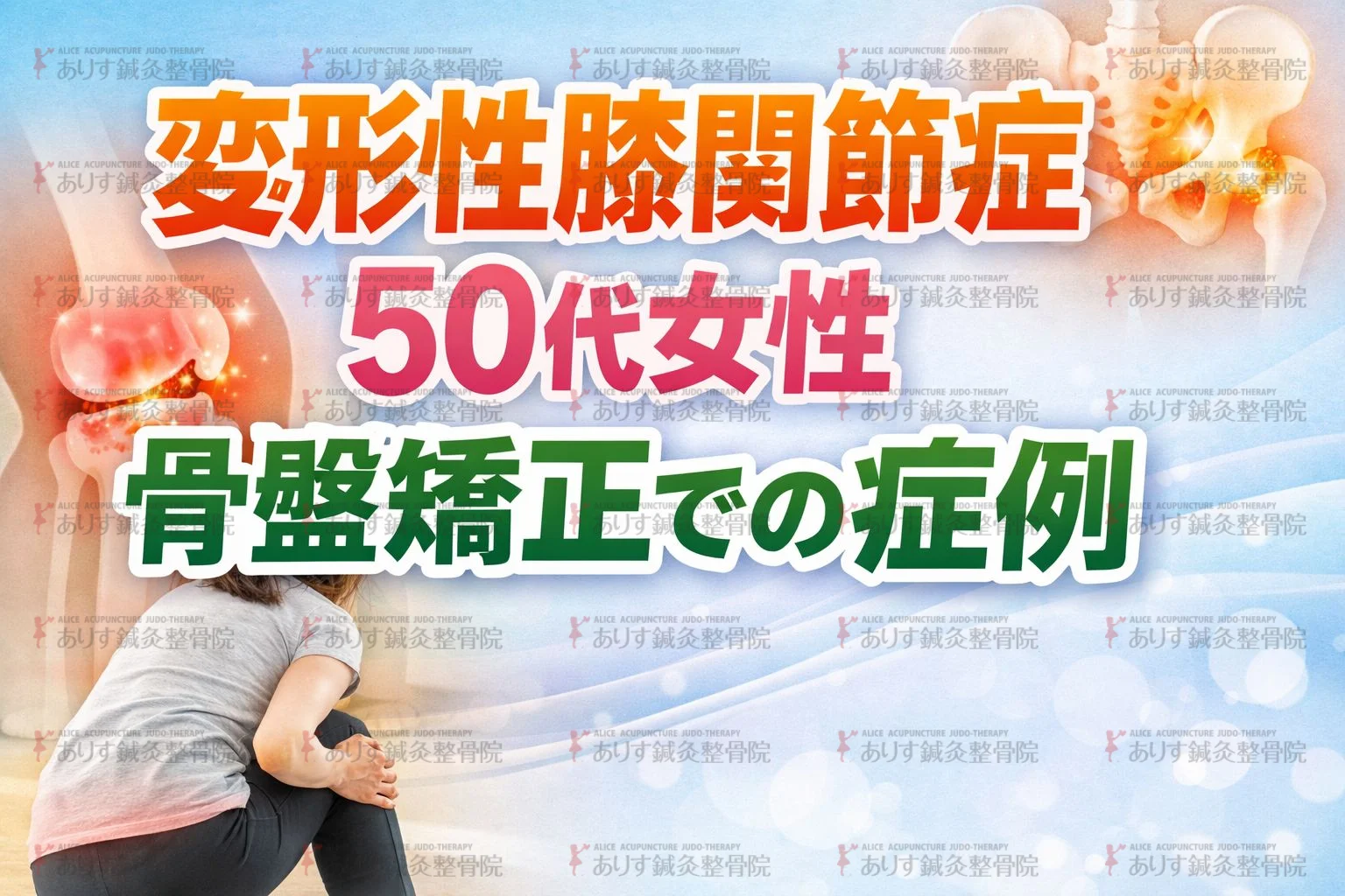 当院では、骨盤・姿勢矯正を通して膝への負担軽減にどのように効果を発揮するかを実感していただいております。症例報告ブログ(https://alice-ss.com/blog/20260406_2383/)をご覧ください。まずはお気軽にお問い合わせ・ご相談ください。